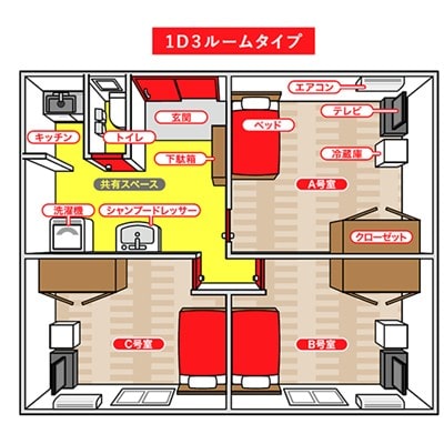 シェアルームは「3ルームタイプ」と「4ルームタイプ」があり、どちらも個室が完備されています。